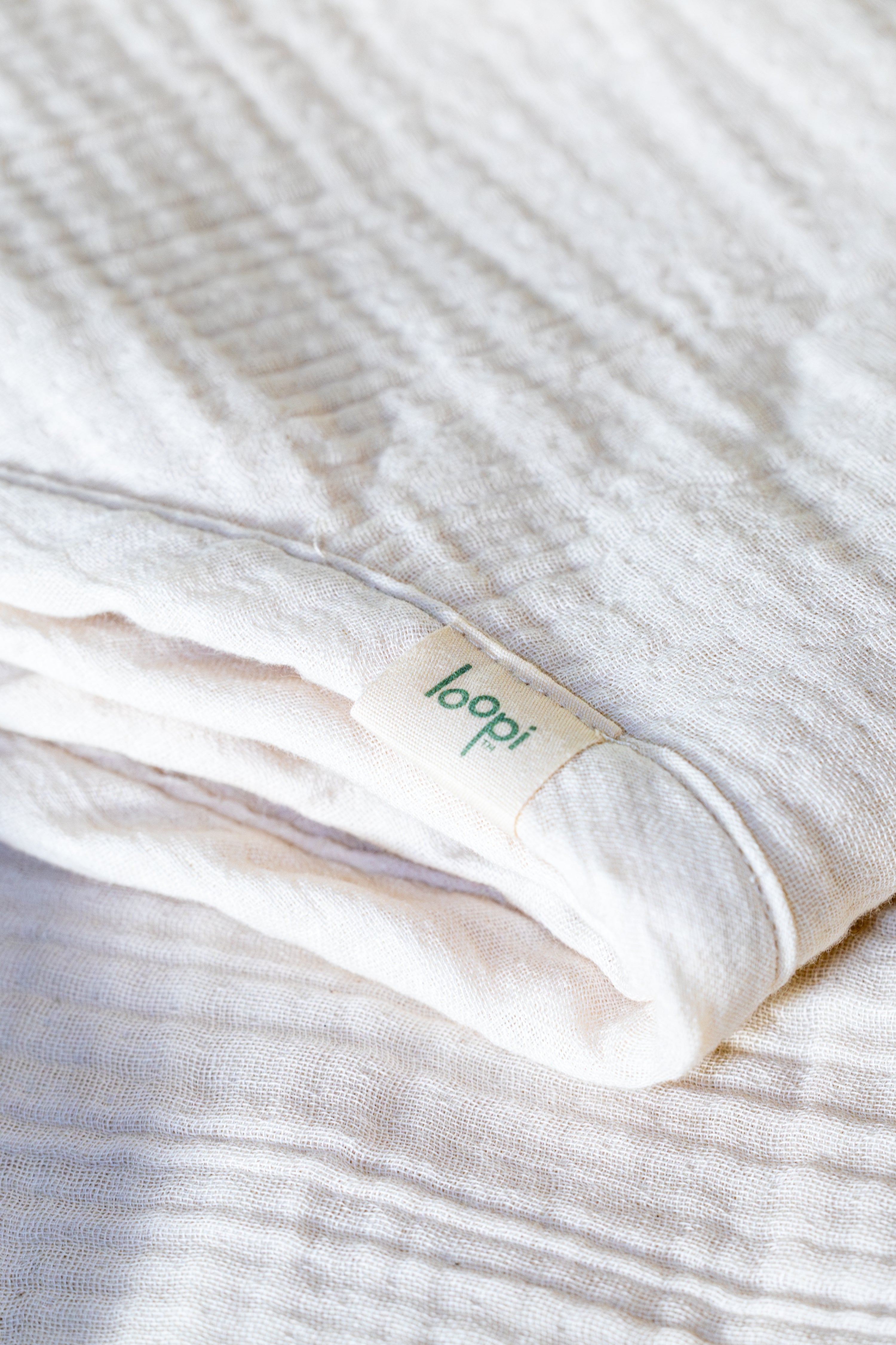 unisex, oversized, and endlessly versatile - for feeding, burping, wrapping, nursing, and beyond. the loopi is currently available in ecru - unbleached natural 100% organic cotton. arrives wrapped in our signature branded organic cotton drawstring bag.